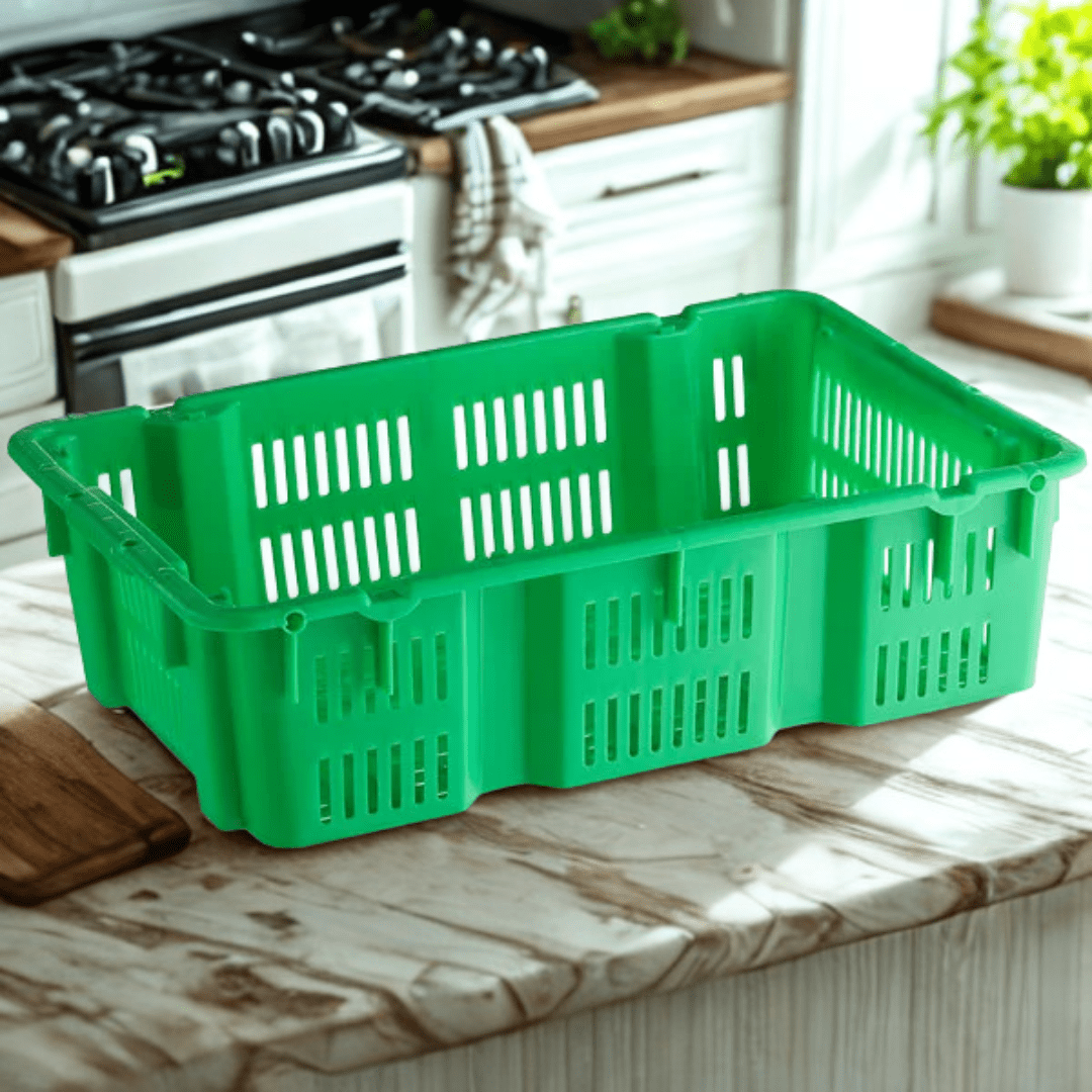 Durable perforated plastic crate ideal for storing and transporting vegetables, fruits, and other fresh produce. The perforated design allows proper air circulation, keeping produce fresh for longer.